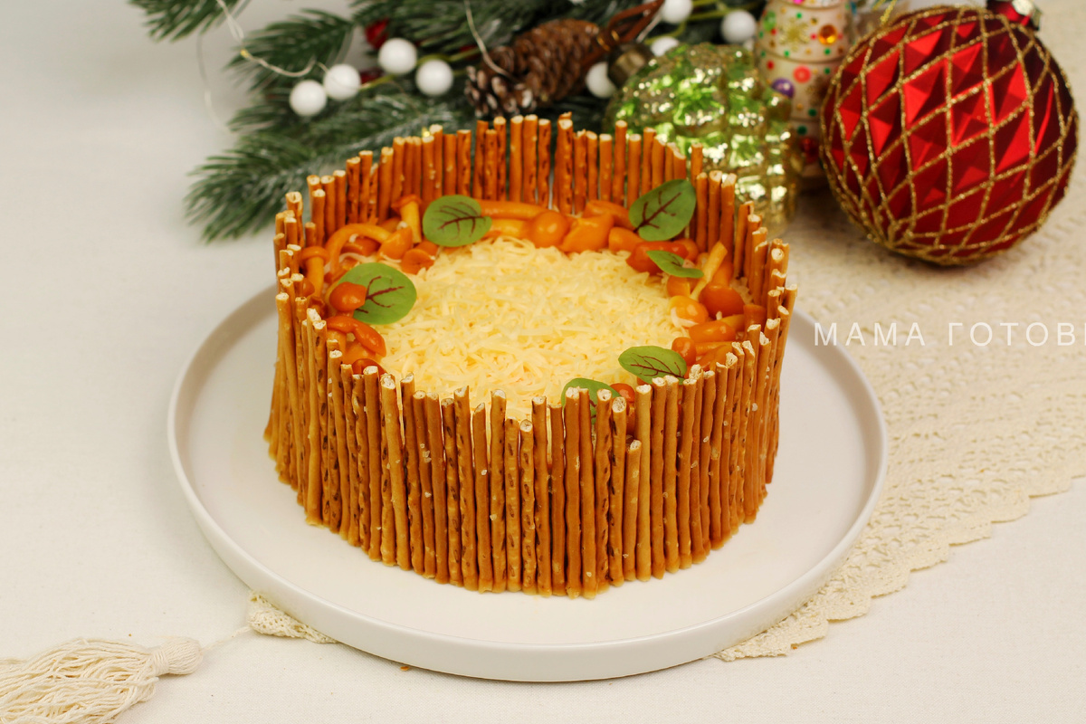 Дайте салату постоять в холодильнике около часа для лучшей консистенции и разведения ароматов. Затем аккуратно уберите кольцо и обмажьте бока салата майонезом, чтобы «заборчик» из соломки держался крепче. Завершите оформление, добавив маринованные опята и листочки микрозелени.