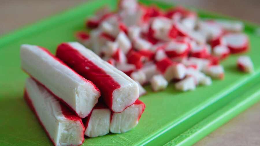 Ингредиенты просты: крабовые палочки, яйца, плавленый сыр и майонез. По желанию — укроп и чеснок для аромата. Все это складывается в чашу блендера и превращается в гладкую массу.