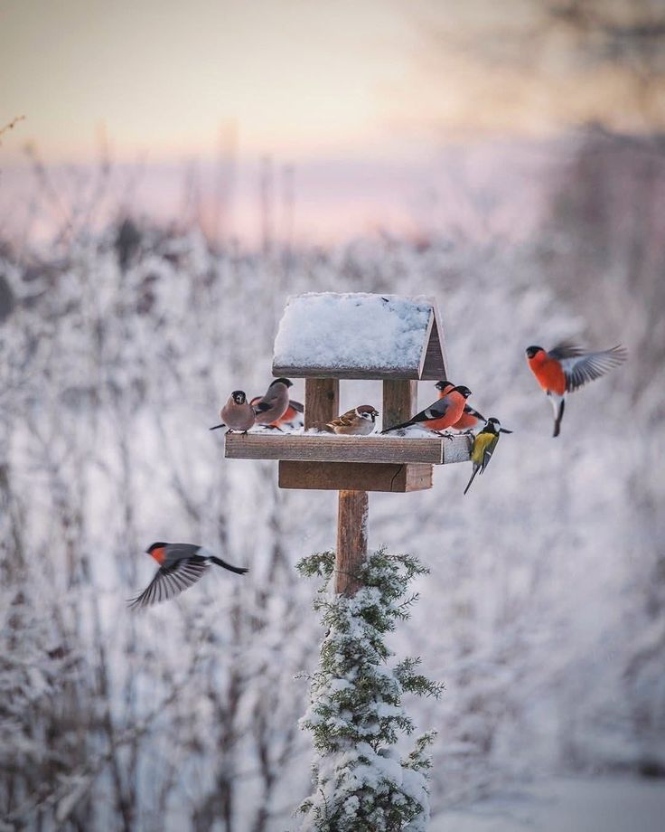 Кормушка — не тюрьма, а временная столовая: она должна помогать пережить морозы и не зависеть полностью от неё. Меню простое: несолёное сало, нежареные семечки, овсяные хлопья, дроблёные орехи и сушёные ягоды. Нужна и вода — тёплая поилка особенно нужна в оттепель, когда птицы слетаются со всей округи.