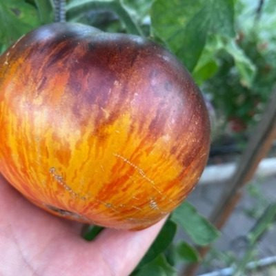Плоды — основная гордость сорта: плоскоокруглая форма и масса около 250–290 граммов. Цвет зрелого томата сочетает желто-оранжевый фон с яркими красными полосами и фиолетовым напылением на плечиках, что придаёт плодам выразительный вид. Вкус богатый и мясистый, что делает их особенно подходящими для салатов и свежего потребления.