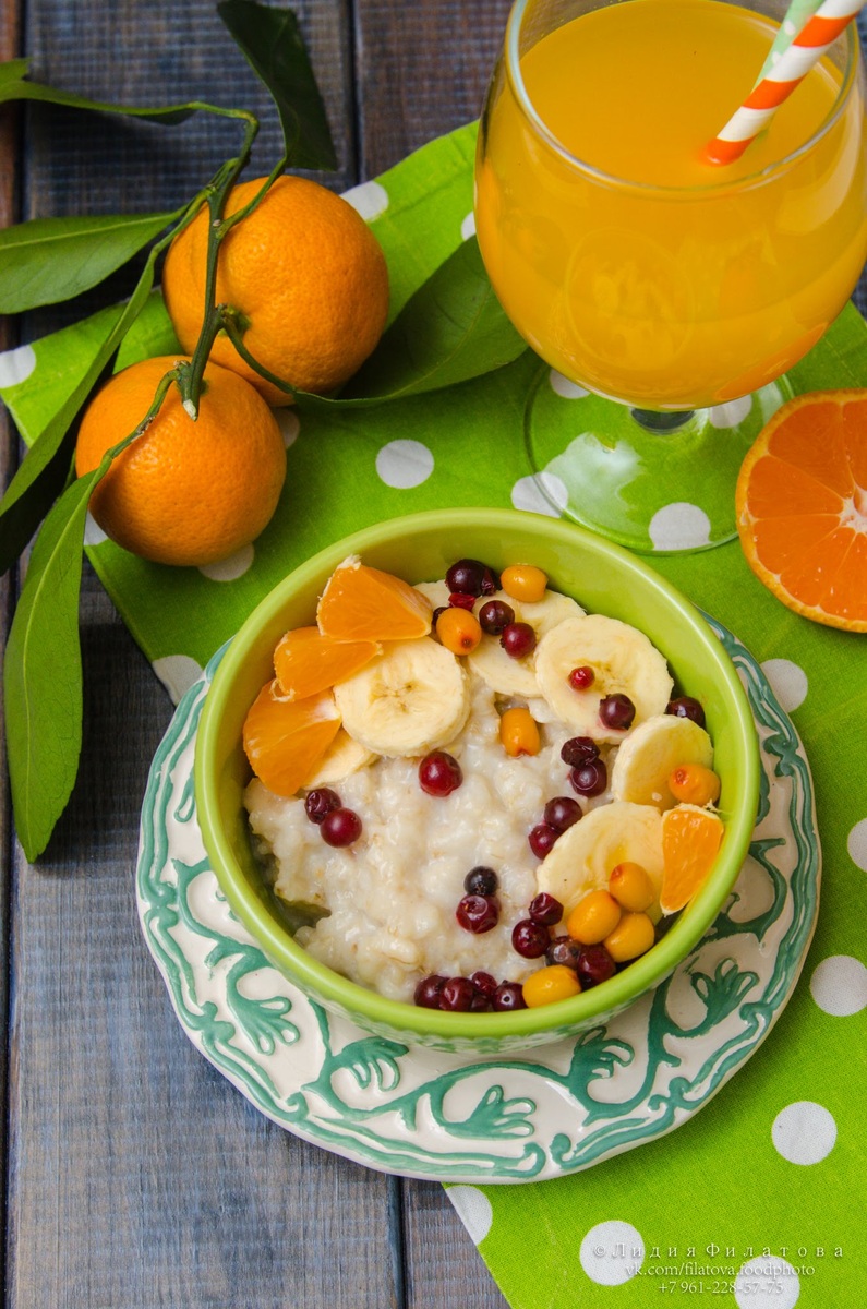 5. Переложите кашу в тарелку, добавьте оставшиеся кусочки банана и мандарина, посыпьте ягодами клюквы, облепихи и полейте медом.
