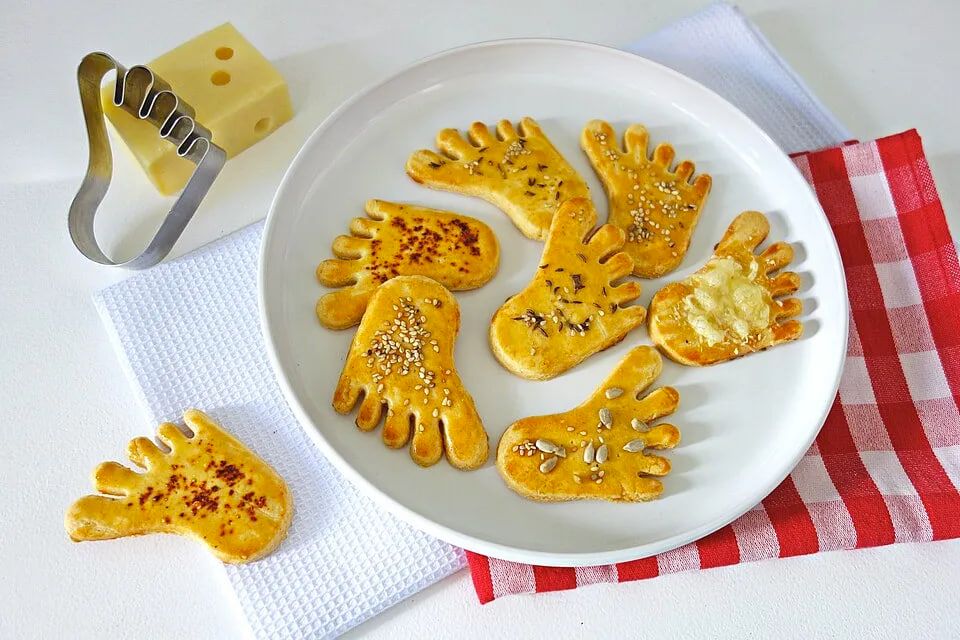 Раскатайте тесто до толщины около полсантиметра и при помощи формочки придайте ему веселую форму ступни. Выложите заготовки на противень, предварительно покрытый пергаментом. Смажьте каждую печеньку желтком и посыпьте выбранными семенами (по желанию).