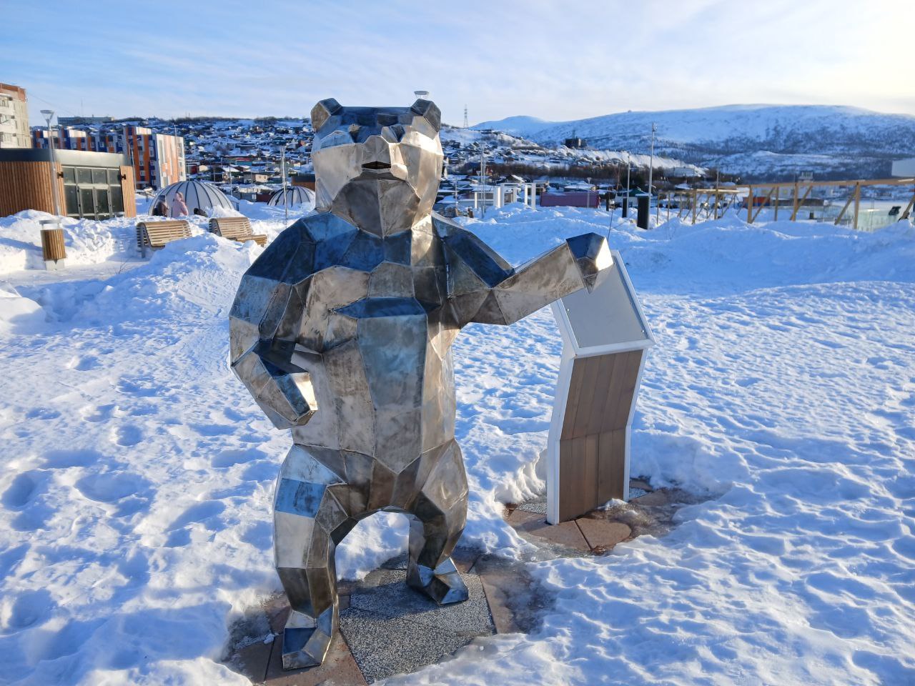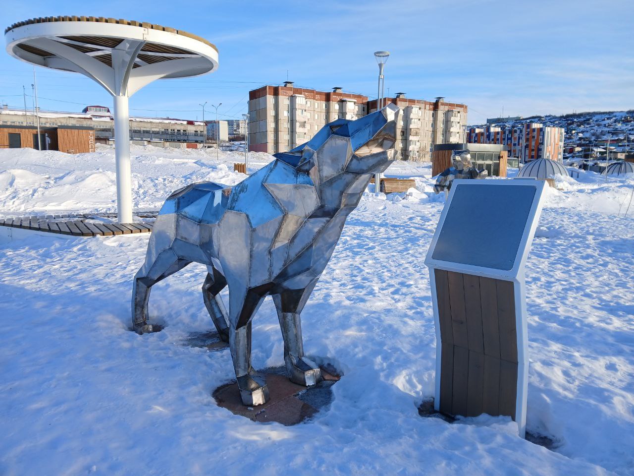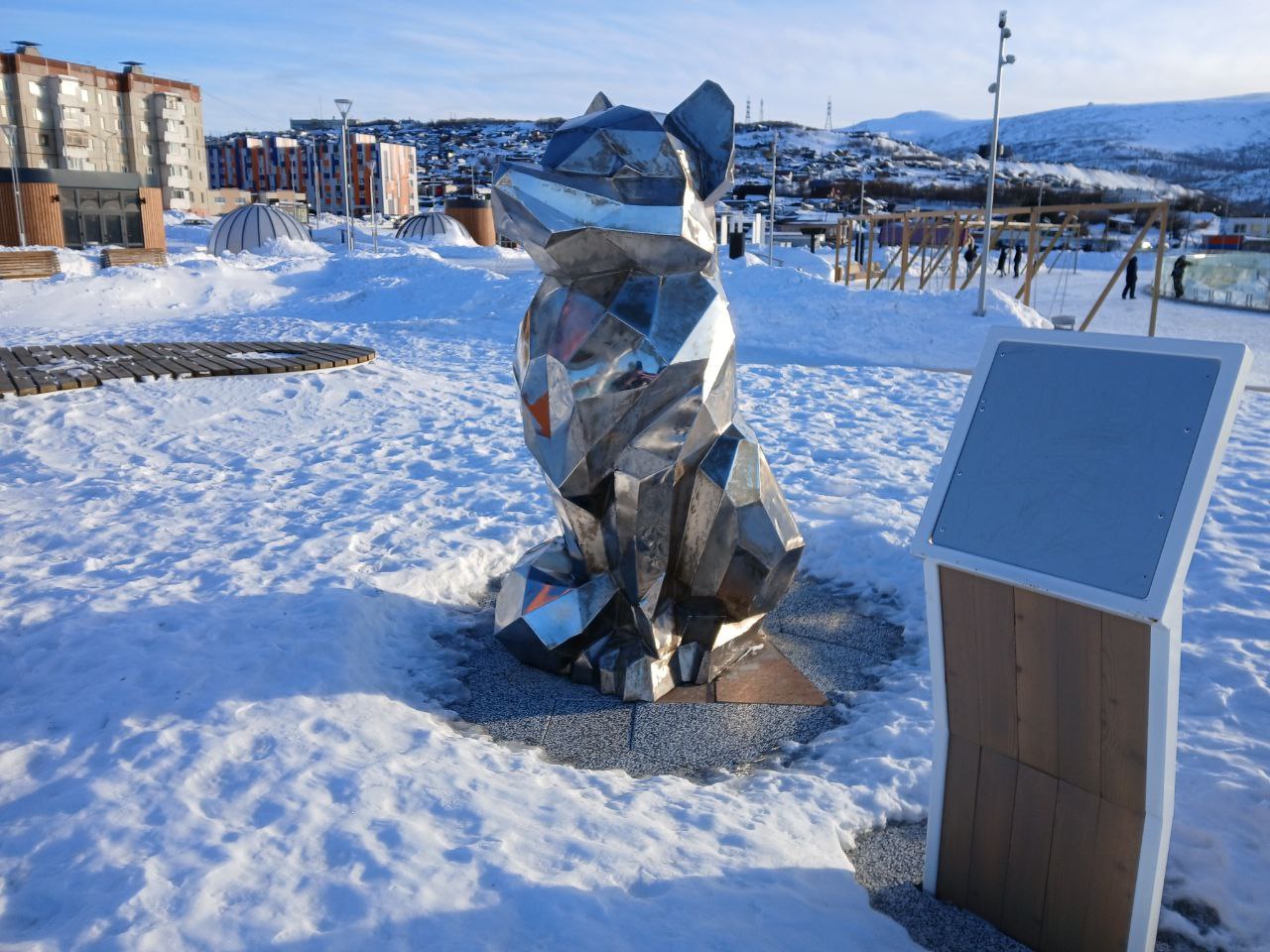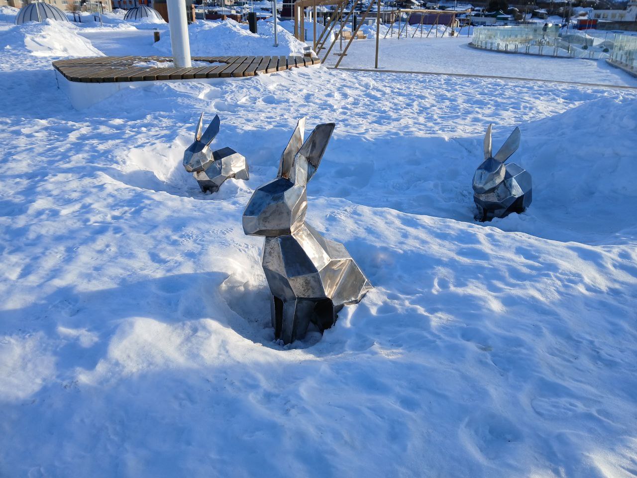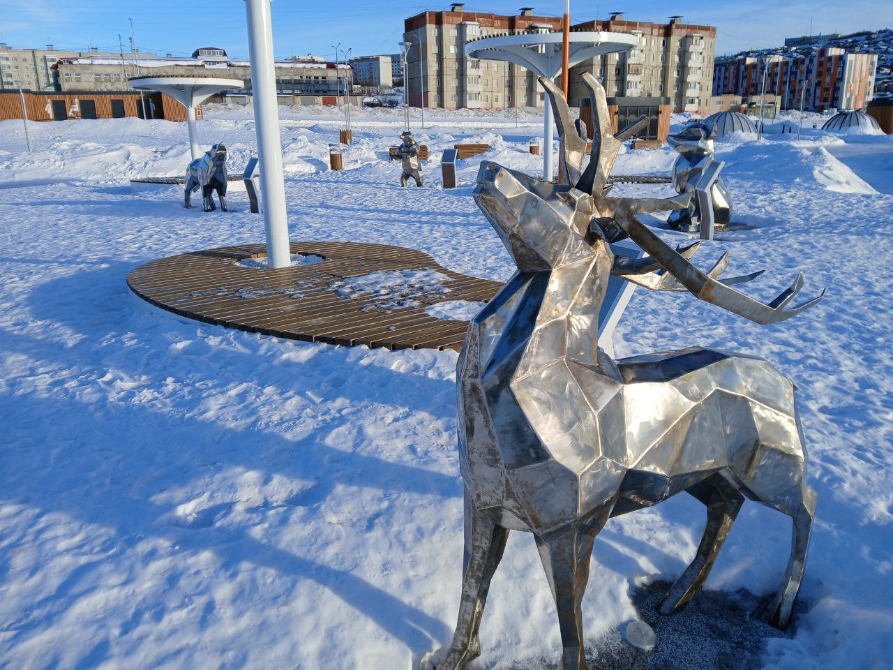 В сразу нескольких граненых скульптурах угадываются и другие представители северной природы: спокойная лисица, настороженный тюлень, рослый мишка, крошечные зайцы и, разумеется, красавец-олень. Рядом с каждой фигурой установлен небольшой стенд, пока пустой, но готовый к установке любого рода табличек. Вероятно, отдыхающих будут кратко знакомить с животным миром Колымы.