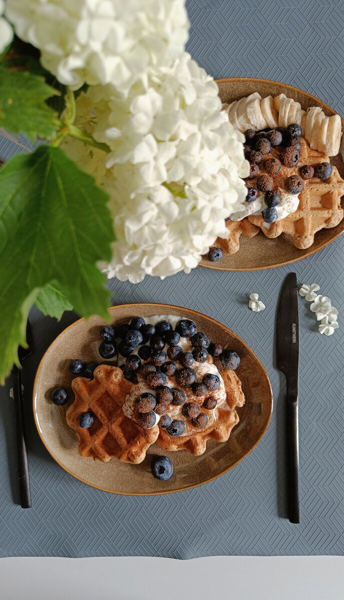 Готовые вафли можно подать со сметаной или творогом и ягодами. Присыпьте сверху какао для финального штриха. Приятного аппетита!