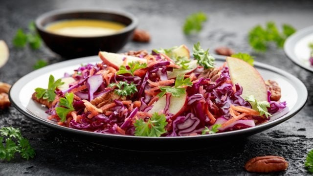 Яркий, освежающий и здоровый — салат из красной капусты с яблоком и имбирем станет настоящим украшением не только повседневного стола, но и праздничного банкетного застолья.