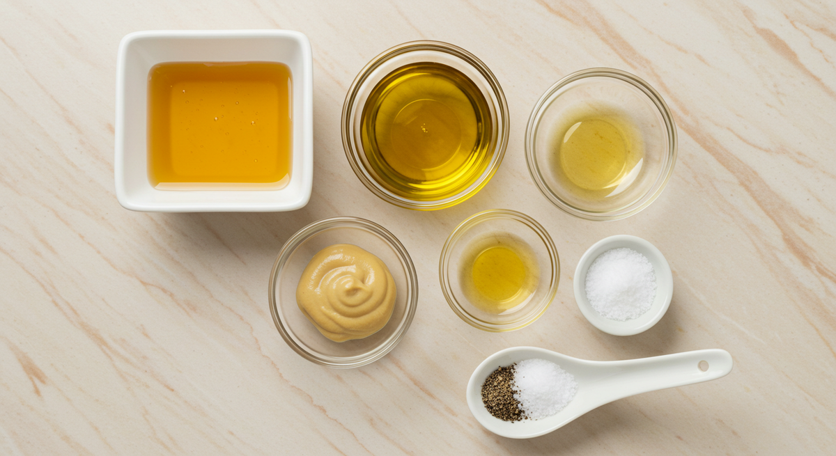 Собрав все ингредиенты, можно переходить к творческому процессу. В отдельной миске нужно смешать мёд, оливковое масло, горчицу и лимонный сок. Сначала смешайте ингредиенты ложкой, чтобы избежать брызг, а затем взбейте все до однородного состояния венчиком или миксером.