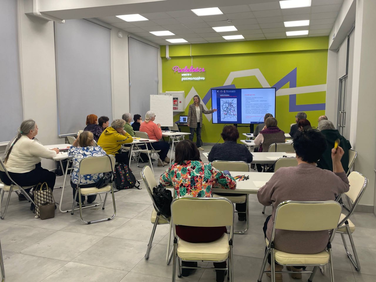 Завершился цикл мероприятий мастер-классом по нейрографике для представителей старшего поколения. Перевести внутреннее состояние на лист бумаги и символически «договориться» с самим собой участникам помогла лектор Общества «знание», член Общественной палаты Ульяна Матвиенко.