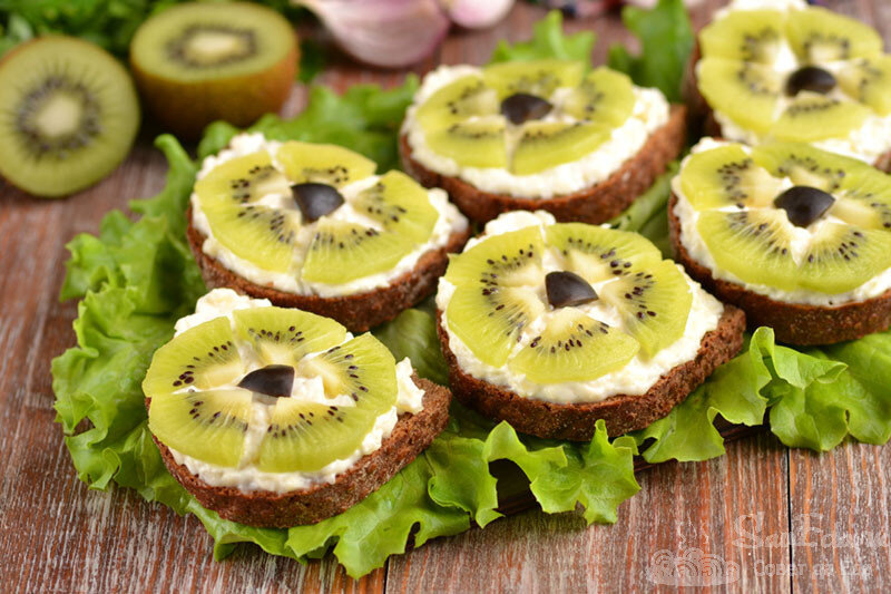 Хлеб нарежьте пополам и, при желании, немного подсушите в духовке. Киви очистите и нарежьте кругами, после чего каждую ломтик разрежьте на 4 части. На кусочках хлеба распределите сырную смесь и сверху уложите 5 ломтиков киви. Для украшения добавьте разрезанные маслины без косточек.