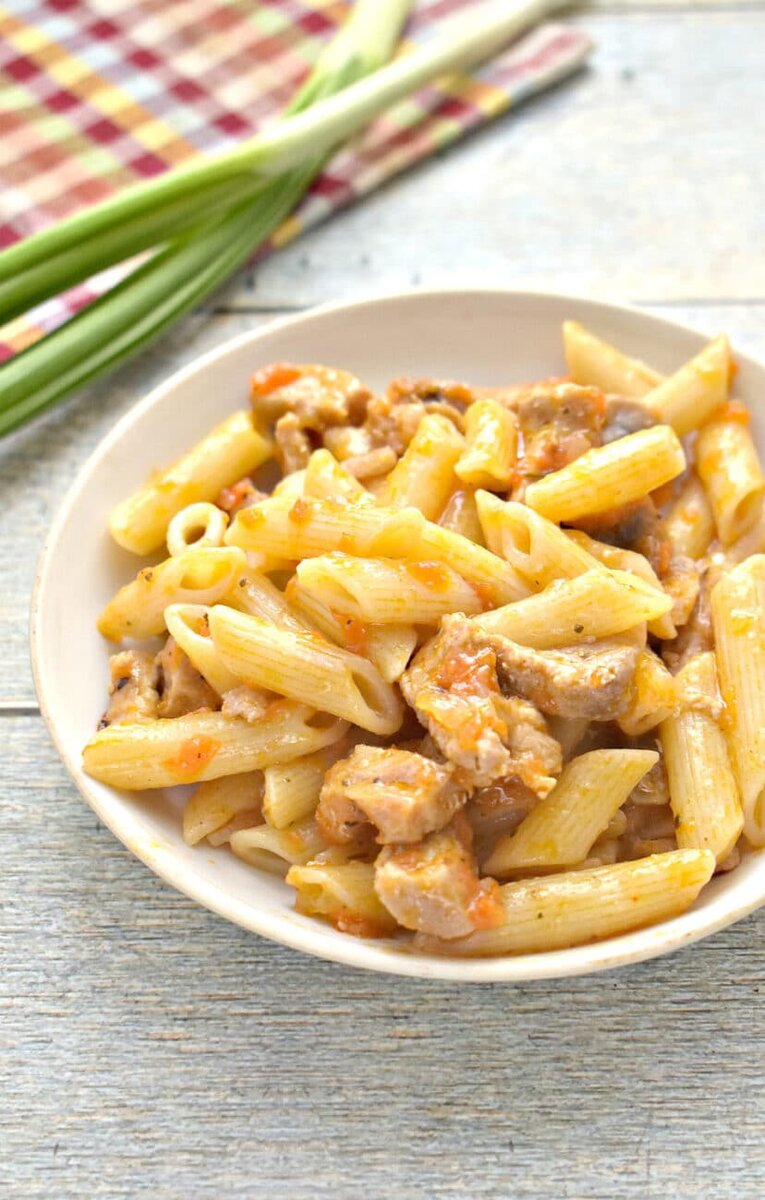 5. Отваренные макароны откинуть на дуршлаг и промыть холодной водой. Перекладываем их к подливе со свининой и грибами, перемешиваем и оставляем на огне под крышкой еще на 1 минуту.