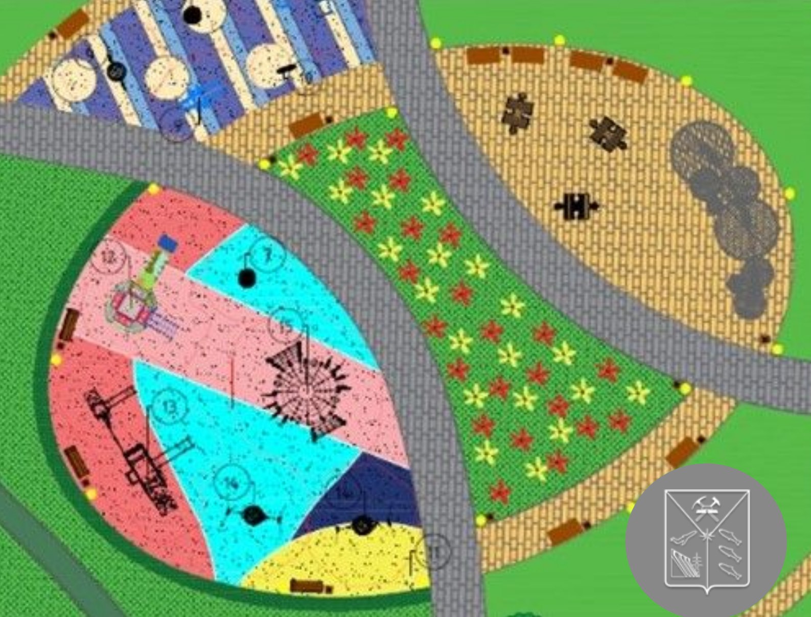 Проектом предусмотрено устройство игровой площадки для детей от 7 до 14 лет, озеленение территории, установка скамеек и урн, устройство дорожек из тротуарной плитки и освещения.