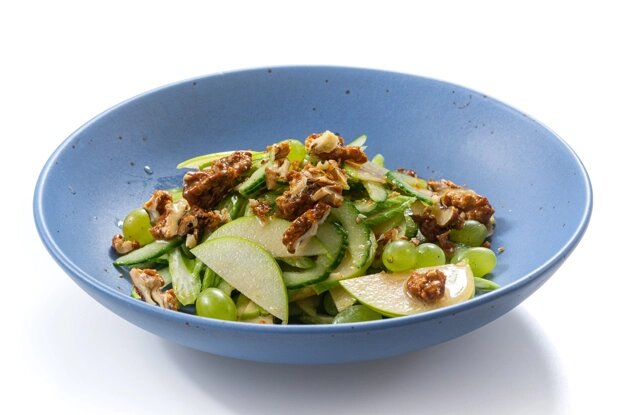 Этот салат станет вашим настоящим союзником в холодное время года, добавляя свежесть и витаминизируя рацион. В его составе бок о бок выступают хрустящий сельдерей, кисло-сладкие зеленые яблоки, сладкий виноград и пикантные соленые огурцы. Сочетание яблочного и лимонного соков придаёт блюду неповторимый кисловатый оттенок, который идеально соотносится с основными ингредиентами.
