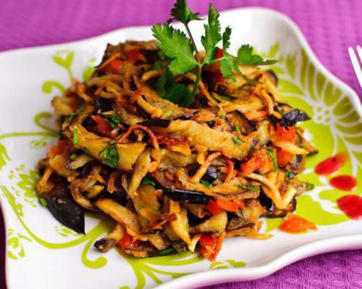 Когда баклажаны остынут, нарезать их соломкой. Твердый сыр натереть на крупной терке, зелень мелко нарезать, а чеснок пропустить через пресс.