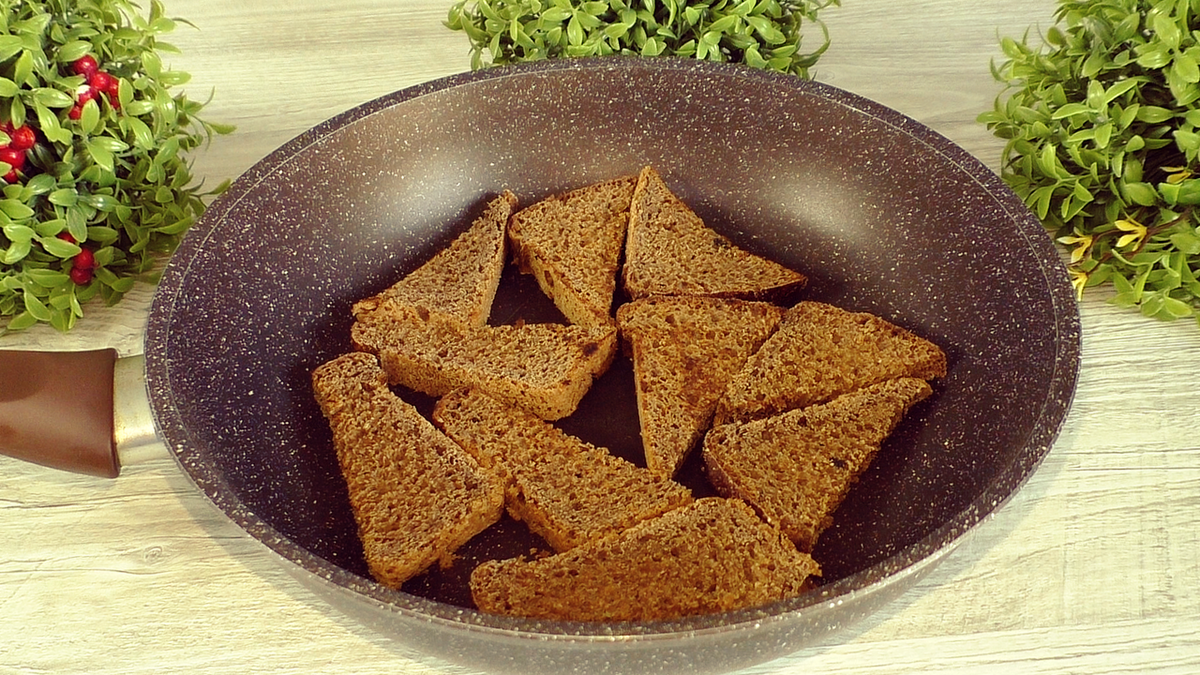 Пока яйца остывают, можно заняться хлебом: поджарьте его на сухой сковороде с обеих сторон. Этот шаг необязателен, но поджаренный хлеб придаст блюду интересный вкус.