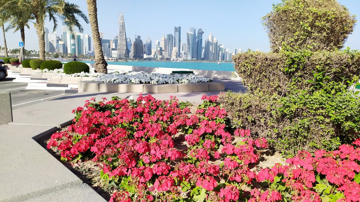 Обнаружилось, что Доха также активно работает над создаваемием зеленого пространства на фоне пустынных ландшафтов. Например, здесь высаживаются огромные площади цветущих растений, а лобелия удивительным образом устойчива к сильному солнцу даже в феврале.