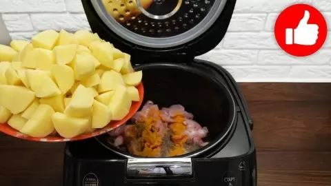 Приготовление начинается с разогрева масла в чаше мультиварки. Затем туда отправляются нарезанные лук и грибы, после чего добавляется куриное мясо и половина из добавленных специй. Далее укладываем картошку, нарезанную не слишком крупно, и добавляем оставшиеся специи. В завершение заливаем холодной водой.