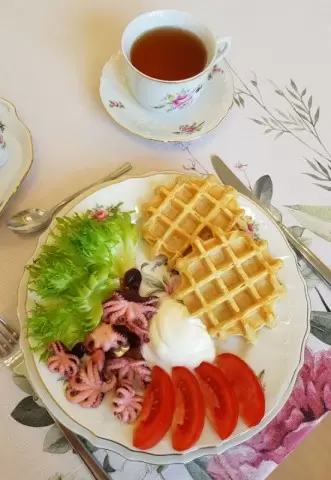 Готовые картофельные вафли можно дополнить сметаной и свежими овощами. Неплохим решением будет подать их с листьями салата и помидорами, а также добавить разнообразие с помощью морепродуктов. Хорошие комбинации не только украсят подачу, но и добавят вкуса к этому простому блюду.