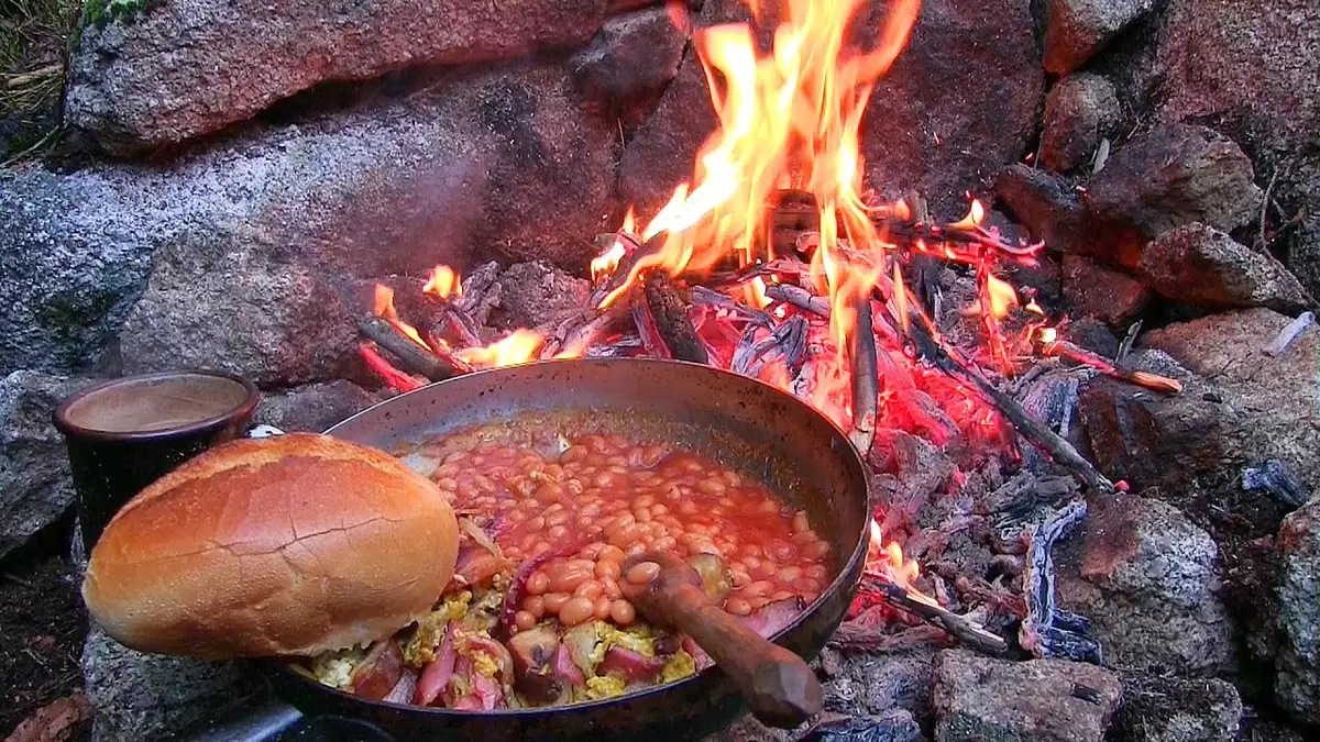 По возможности, готовить этим образом лучше всего на костре в котелке. Но, если подходящих условий нет, подойдет и кастрюля на плите. Сначала разогрейте масло, обжарьте лук до золотистого состояния, затем добавьте фасоль с жидкостью, бекон, перец чили, морковь и томатную пасту. Кипятите в течение нескольких минут, добавьте яйца и варите еще три минуты, непрерывно помешивая. Перед подачей посыпьте нарезанной зеленью и выдавленным чесноком.