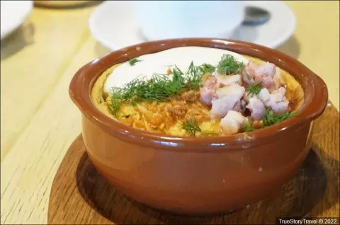 Татары также берут своё: на их столах часто можно встретить губадию — многослойный круглый пирог, сделанный из тонкого теста и разнообразных начинок. Традиционно используется рис, яйца и творог, но добавление сухофруктов придаёт блюду уникальный вкус.