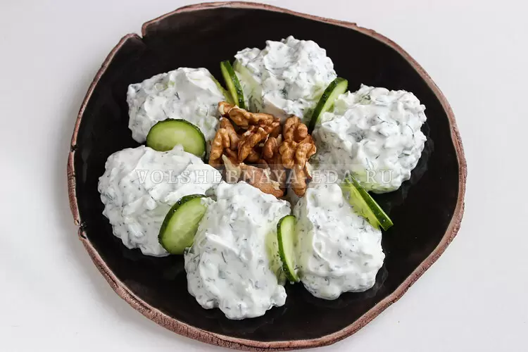Готовую массу можно создавать в виде шариков, чередуя с ломтиками свежих огурцов, а по центру разместить орехи. Такой салат станет отличной закуской и несомненно украсит любой стол. «Снежанка» – это превосходный способ насладиться свежестью и простотой болгарской кухни!