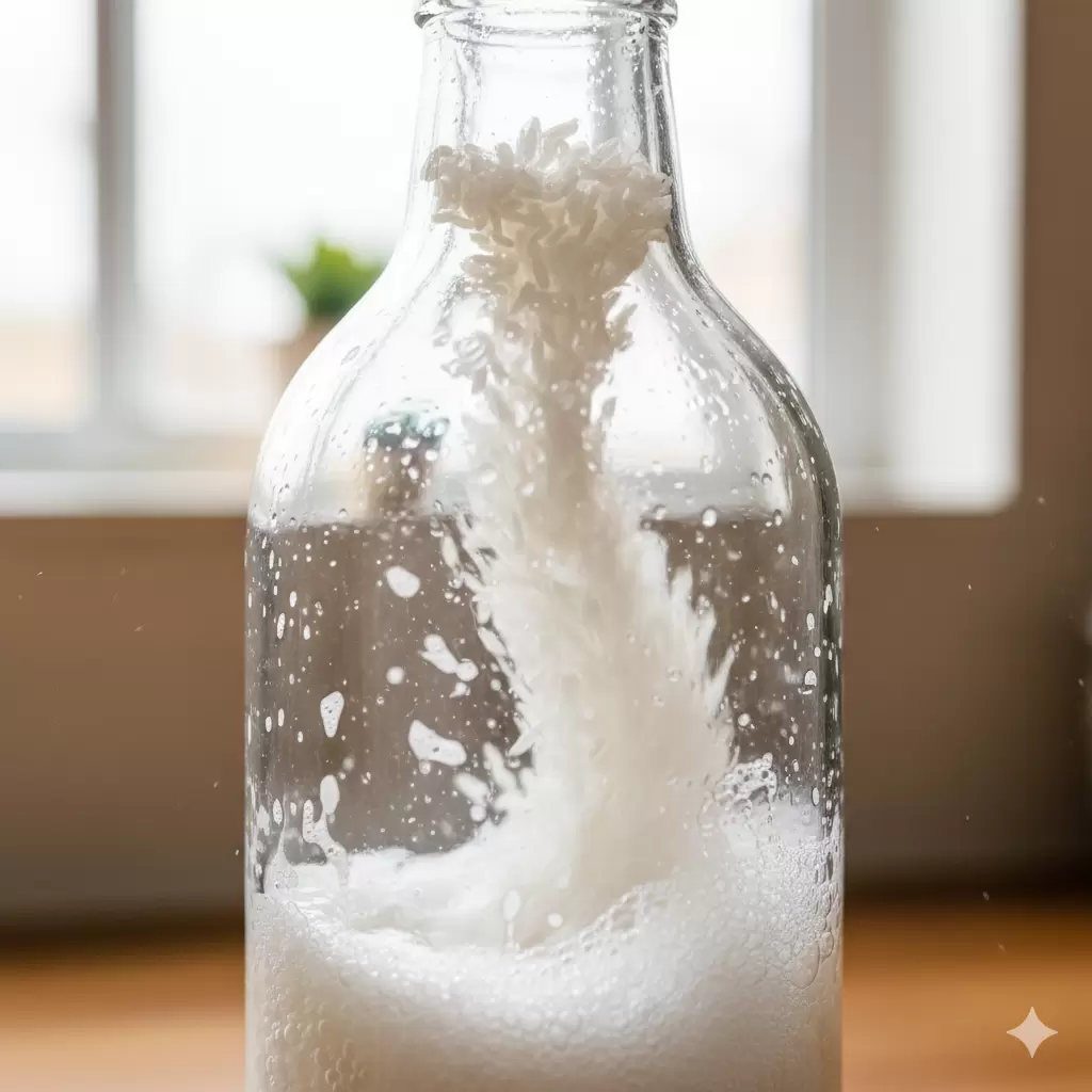 Зерна риса выступают в роли миниатюрных скребков, подвергая стенки и дно емкости ударам при встряхивании. Это способствует эффективному удалению налета, остатков сока и соли, не повреждая стекло. Мыльная вода способствует растворению загрязнений, а рис тщательно очищает труднодоступные участки.