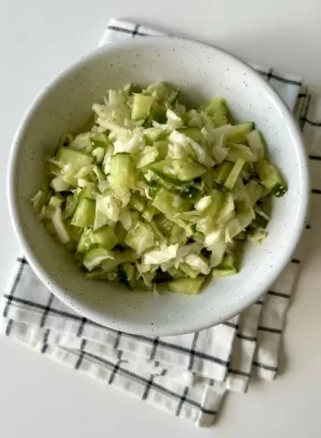 - Первым делом, молодую белокочанную капусту тонко нашинковать. После этого добавить в салат сок лимона, зернистую горчицу и ароматное подсолнечное масло, приправив всё это адыгейской солью.