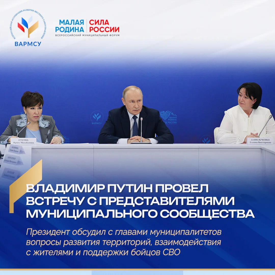 Встреча прошла в рамках III Всероссийского муниципального форума «МАЛАЯ РОДИНА – СИЛА РОССИИ», организованного ВАРМСУ при поддержке Администрации Президента России. Ранее Владимир Путин принял участие в награждении победителей и лауреатов премии «Служение».
