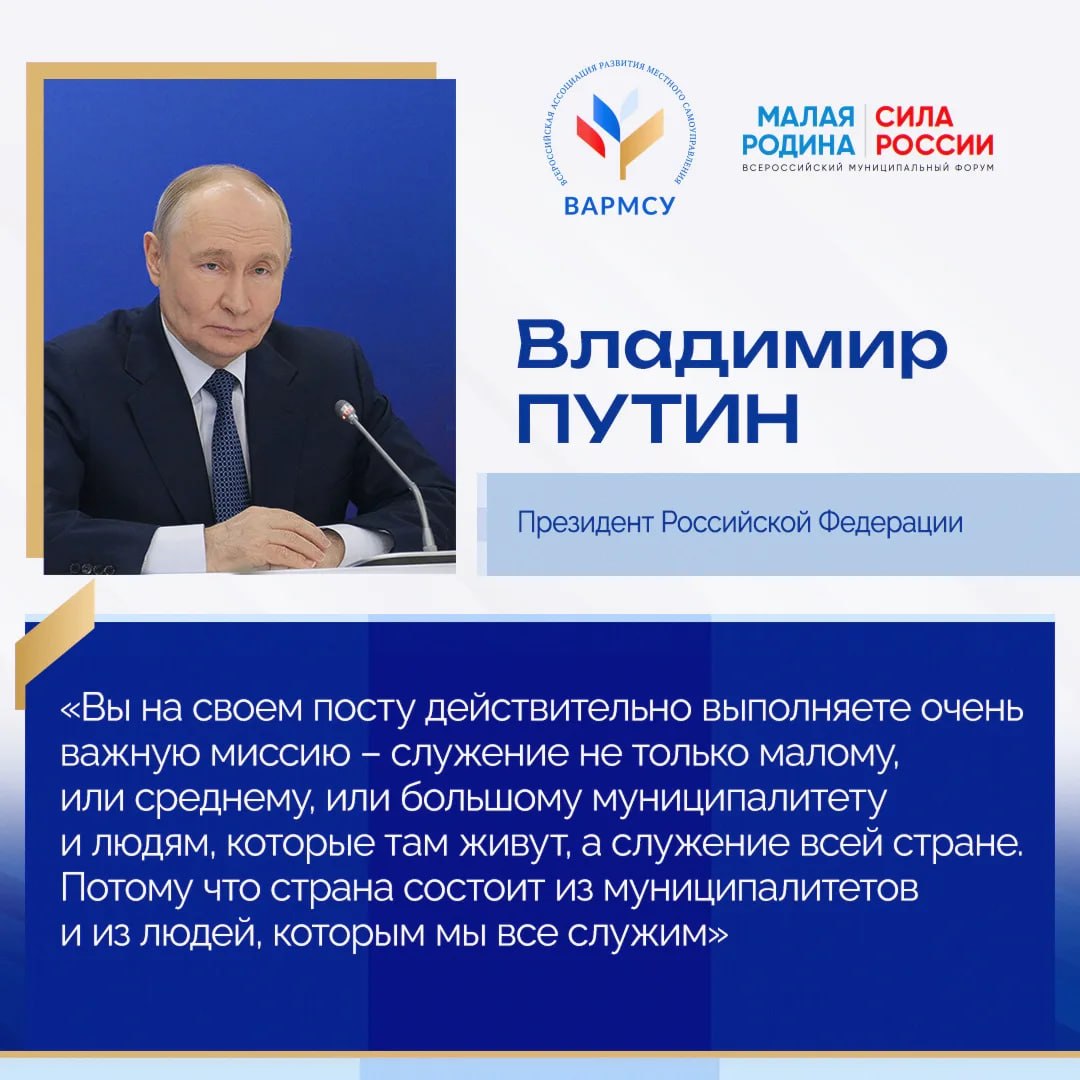 В День местного самоуправления глава государства встретился с представителями муниципального сообщества. Диалог прошел в рамках III Всероссийского муниципального форума «МАЛАЯ РОДИНА – СИЛА РОССИИ», организованного ВАРМСУ при поддержке Администрации Президента России.