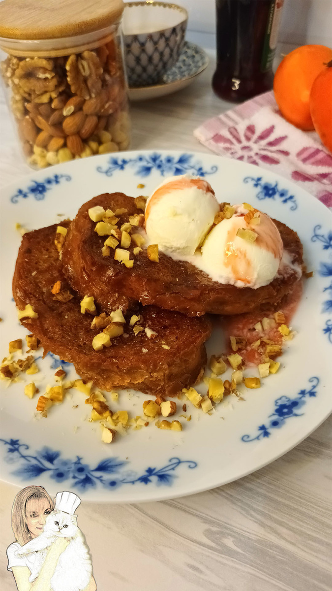 Подавайте готовые французские тосты с шариком мороженого, полив любимым сиропом и посыпав орехами для дополнительного вкуса.