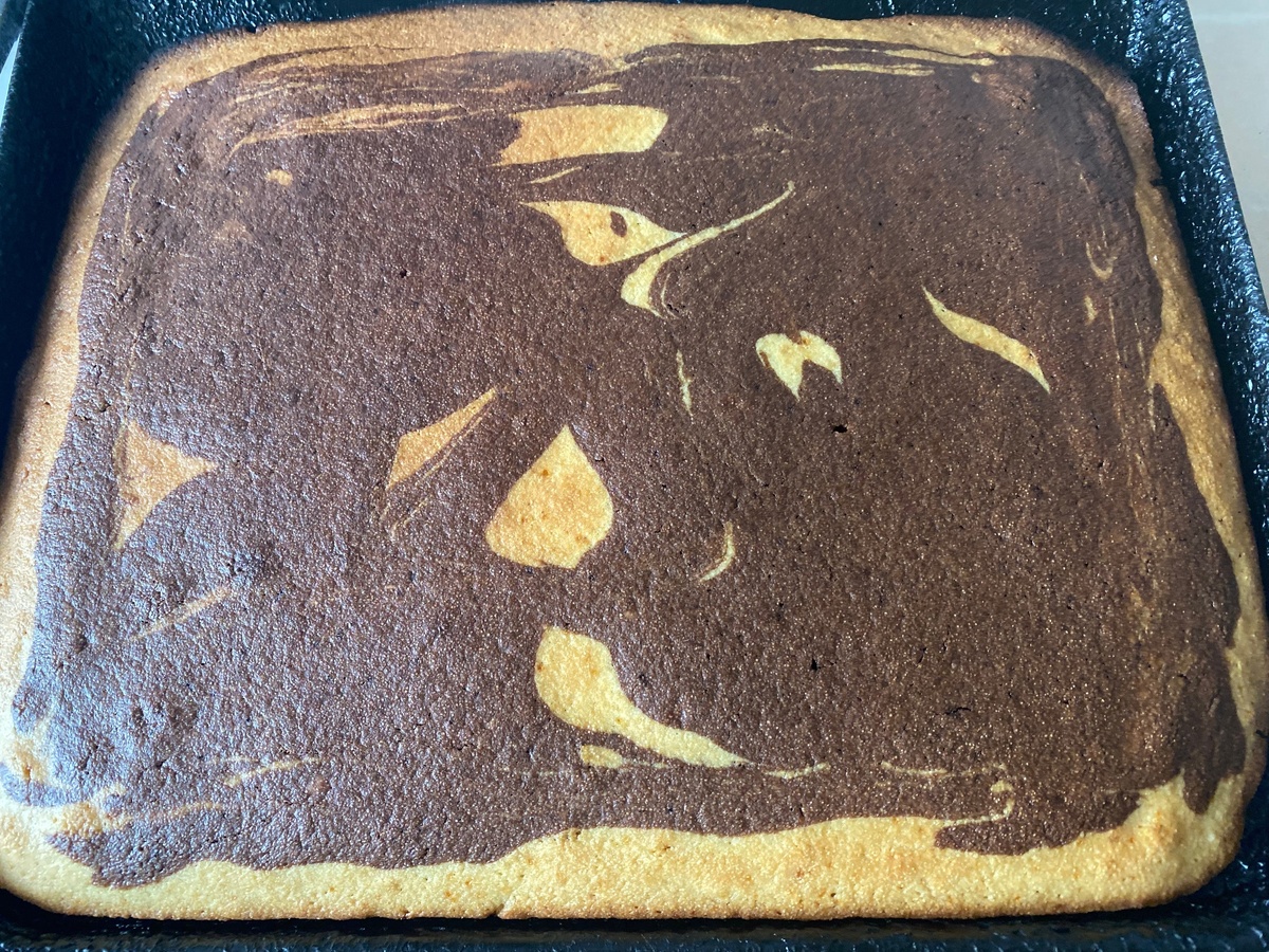 На противень сначала вылить белое тесто, затем темное, образуя произвольные линии для создания эффектного зебрового рисунка. Выпекать пирог в предварительно разогретой до 180°C духовке в течение 30-40 минут. Проверить готовность можно при помощи зубочистки.